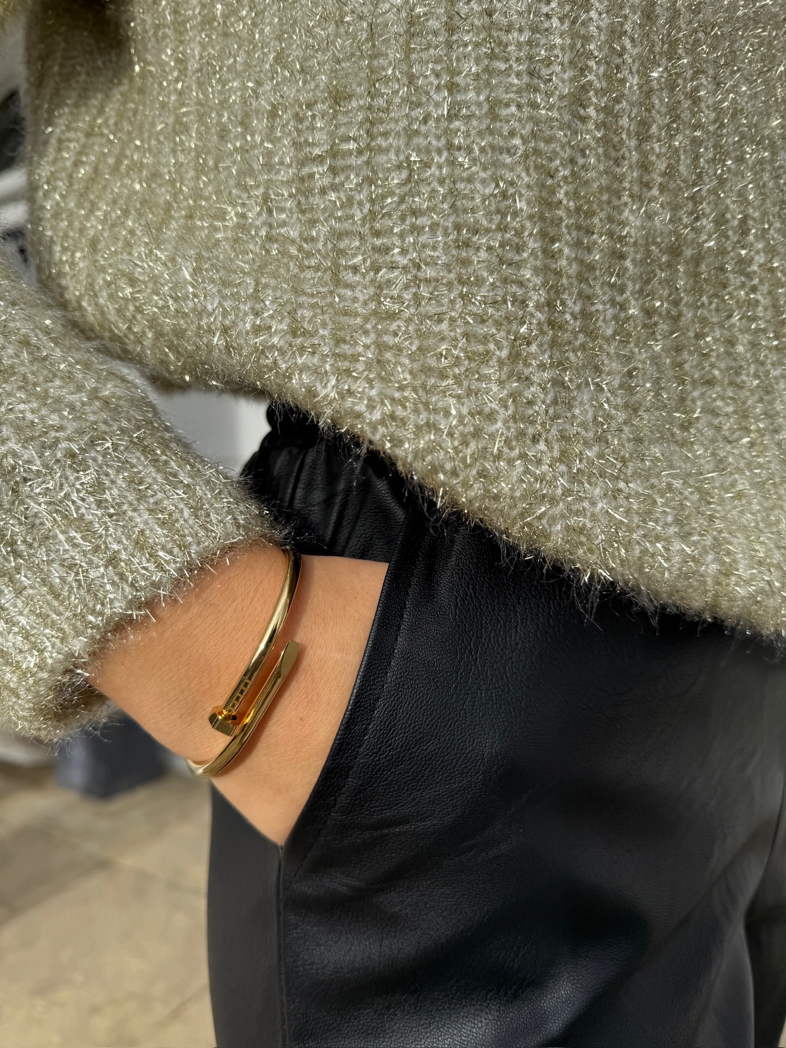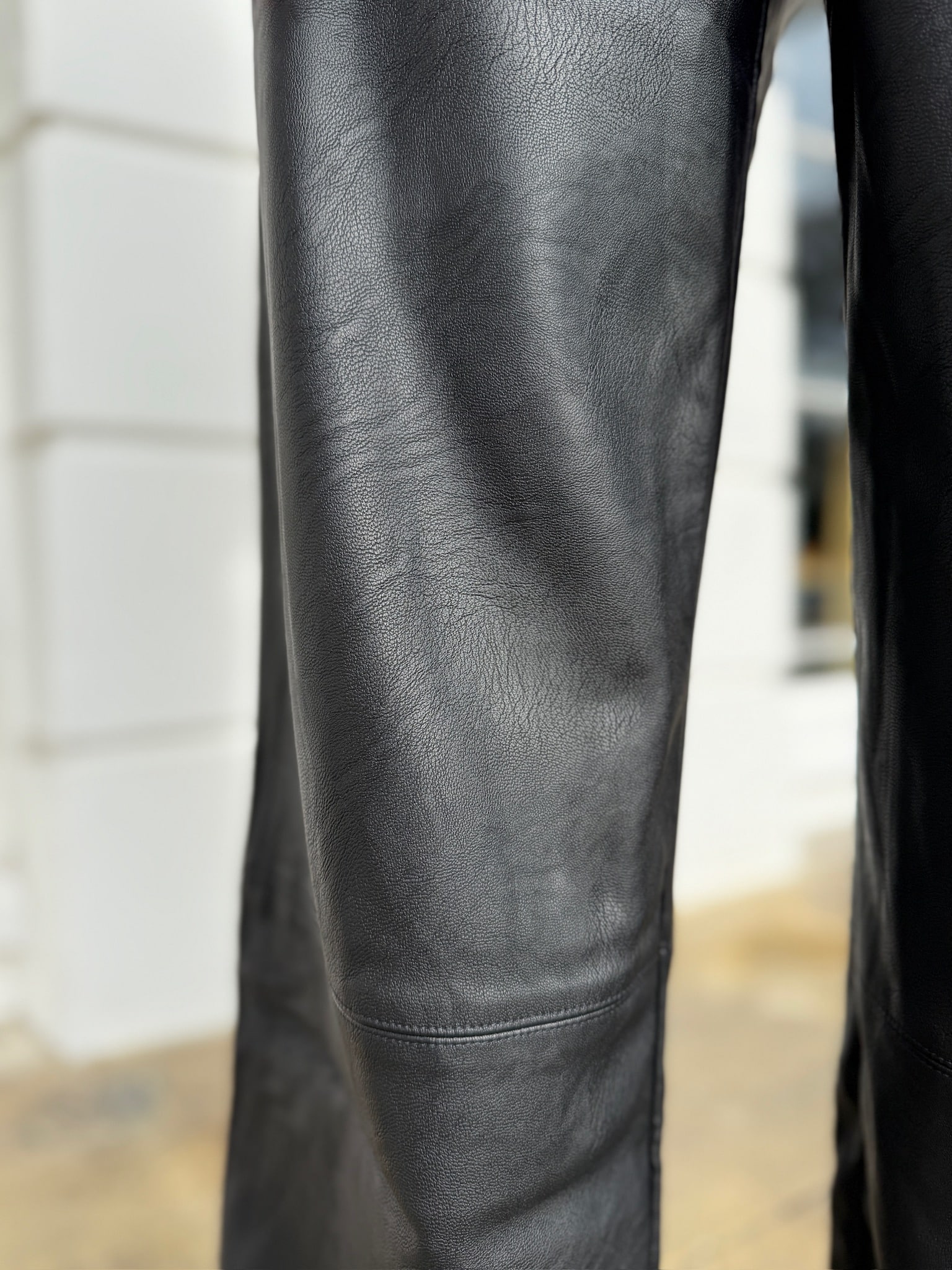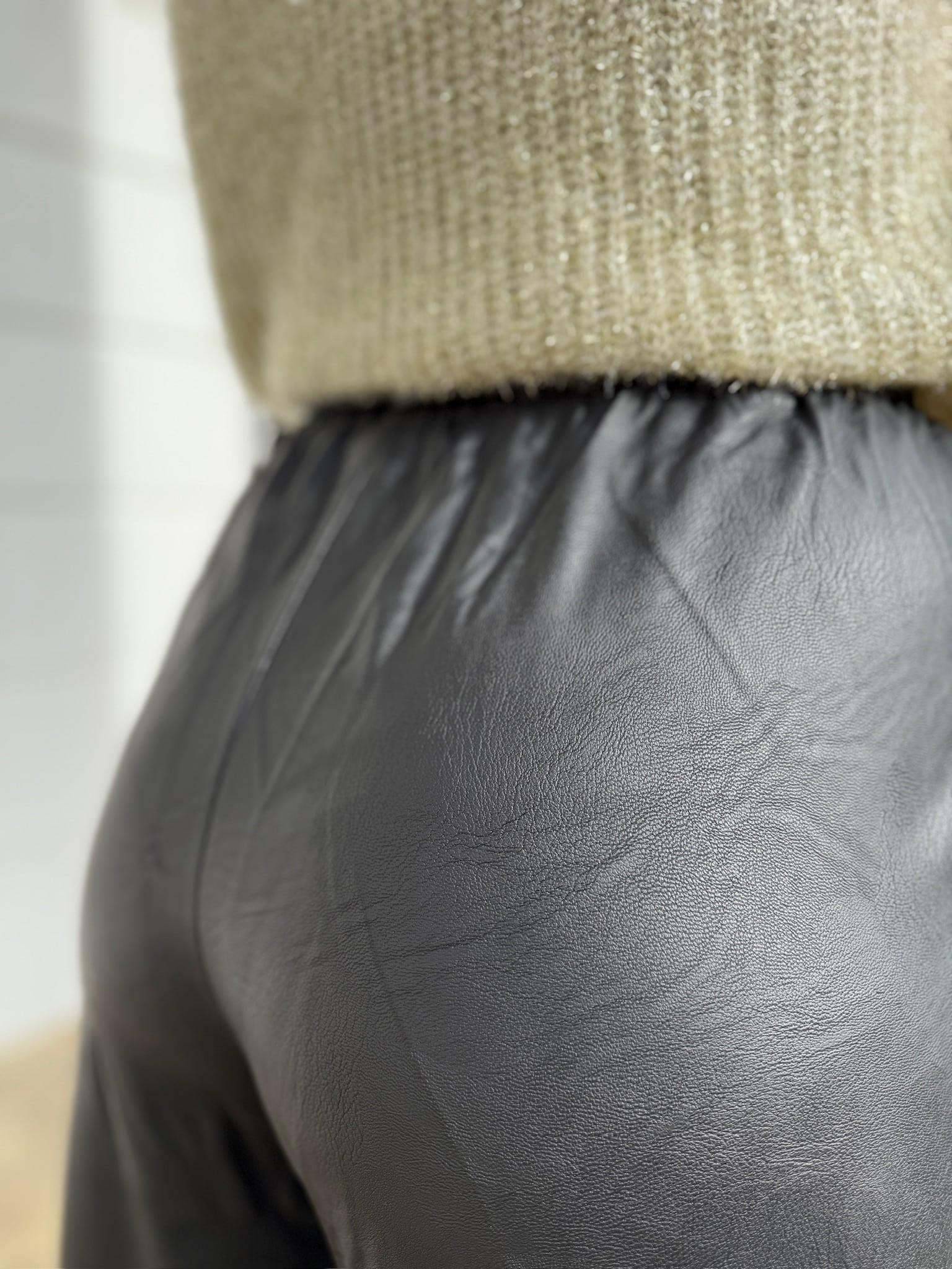 Pockets and a loose leg in a soft fabric that looks like real leather.
